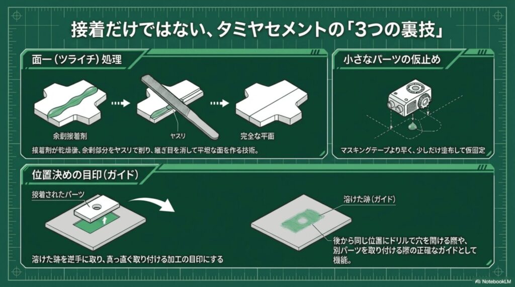 接着剤を付けたパーツを剥がすと跡が残るので、それを目印にして穴を開けたりと加工する際の目印とすることができます!