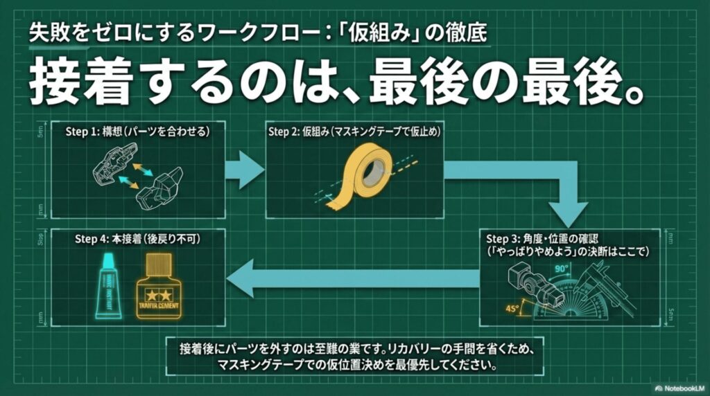 接着後はパーツを外すことが難しく、外した後のリカバリーもめんどくさい。そのうえ、やっぱりここのパーツは接着するのをやめようとなることが多々あります。