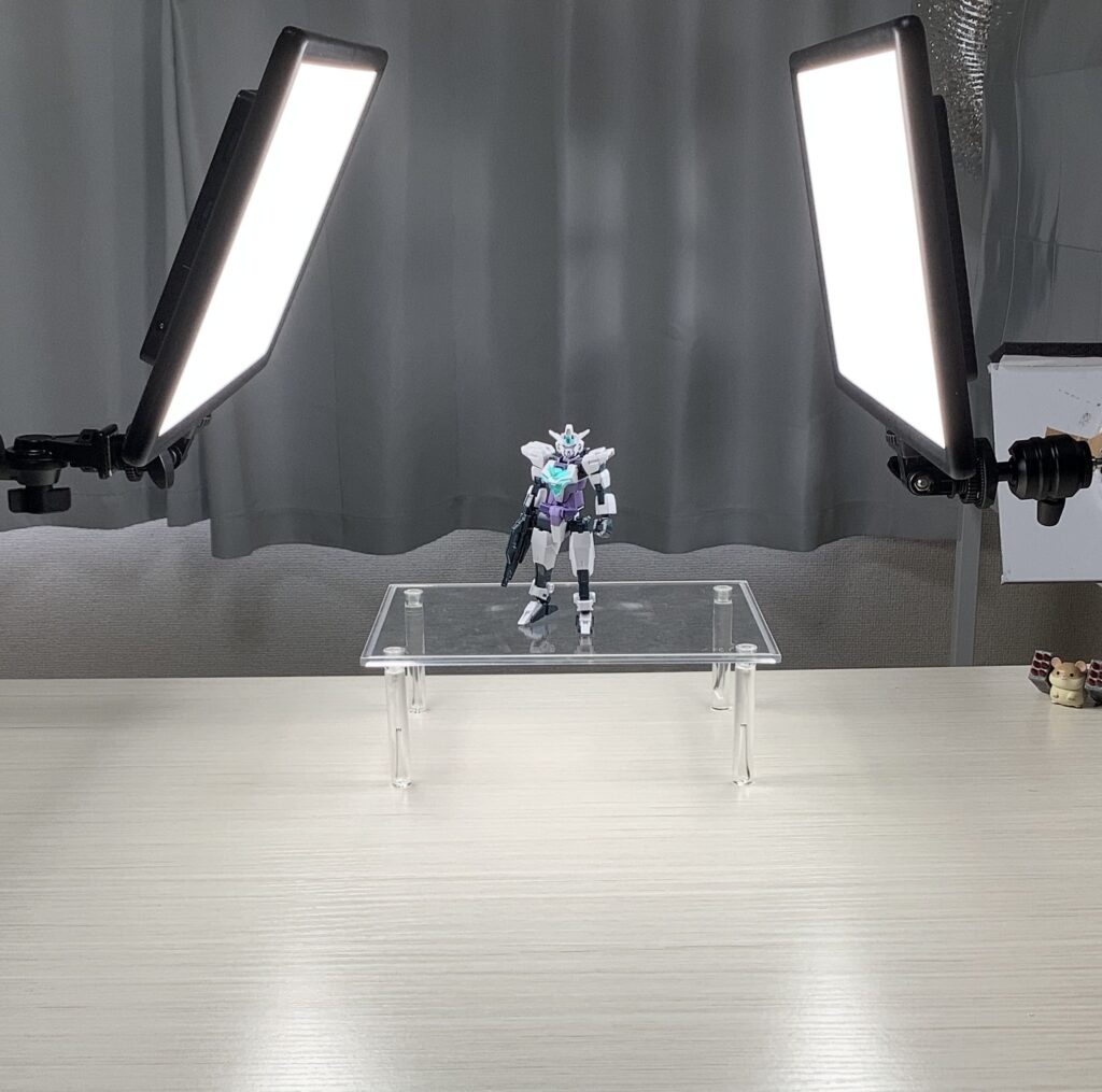 ⇒当然のことながら撮影に照明は必須。自分が作ったガンプラを少しでもかっこよく見せるために、少しでも明るさが欲しい。明るければ明るいだけ良い。
